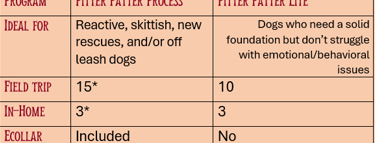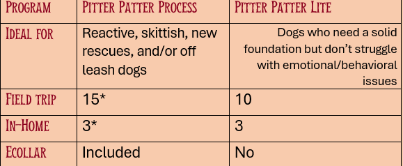 Pitter Patter Lite is perfect for dogs without major behavioral hurdles who just need a strong foundation, consistency, and reliable manners in public.